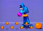 Un étrange chien bleu – portant le logo de FR3 en médaillon – joue avec une balle jaune… qui ne se laisse pas faire.
