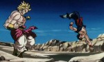 Le lendemain, à l'aube, Broly arrive au village et affronte Videl qu'il met vite K.O. Puis il affronte Trunks et Son Goten mais sa puissance est telle que les enfants ne peuvent faire le poids. Son Gohan, qui a ressenti l'énergie de Broly, vient secourir les enfants. Mais lui aussi se fait rosser...