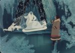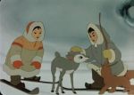 Les deux enfants restés seuls avec leur petit chien, se sentant quelque peu coupables de n'avoir pas écouté les conseils de leur mère, n'ont maintenant pour seul désir que de retrouver cette dernière... (on ne peut que deviner leur culpabilité dans la version française car comme pour quelques autres plans ou séquences, cette VF issue de l'américaine a été amputée de la petite scène suivant l'enlèvement de la mère, celle-ci montrant les enfants, seuls et désolés, auprès du feu éteint dans la yarangue). C'est alors plein de détermination que Jato et Teione, accompagnés de leur petit compagnon canin, partent pour les grands espaces glacés avec pour ultime but de sauver leur maman des griffes glaciales de Dame Blizzard...